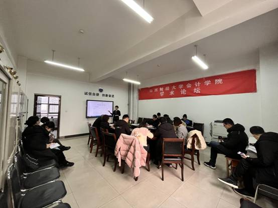 田峰老师汇报的内容围绕国家审计高质量发展问题展开,主要包括:研究背景、文献综述、研究内容、重点难点,研究思路等。田老师汇报结束后,学院师生围绕国家审计“十四五”规划等政策背景对报告内容进行了点评与讨论。