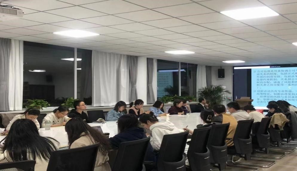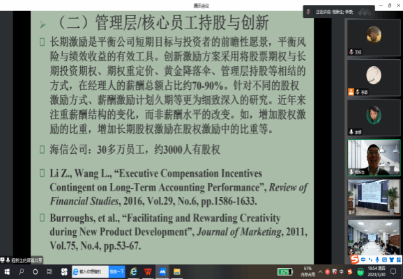 在专题报告环节,程新生教授做出了题为《公司治理与科技创新》的主题讲座,主要从内部治理和外部治理两个层面对科技创新的影响研究进行分享。其中,内部治理方面包括股东行为对创新的影响,董事会治理对创新的影响,管理层激励约束对创新的影响;外部治理方面包括机构投资者对创新的影响,分析师跟踪对创新的影响,卖空机制对创新的影响,供应链治理对创新的影响,公众和利益相关者对创新的影响。程新生教授表示不论从内部治理还是外部治理的角度,关于企业的科技创新机制都非常值得研究,同时程教授鼓励同学们多多去企业调研,为论文研究提供新思路。