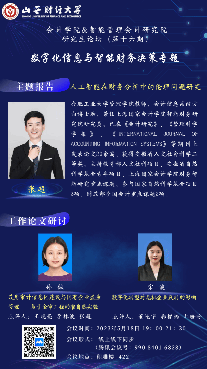 与智能管理会计研究院联合举办了研究生论坛(第十六期)。本次论坛的主题为“数字化信息与智能财务决策”,采取线下与线上同步的方式。轮值主持人为直播做爱