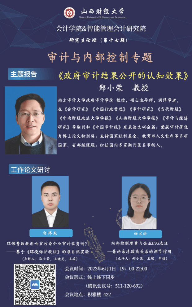 与智能管理会计研究院联合举办了研究生论坛(第十七期)。本次论坛的主题为“审计与内部控制专题”,采取线下与线上同步的方式。轮值主持人为直播做爱