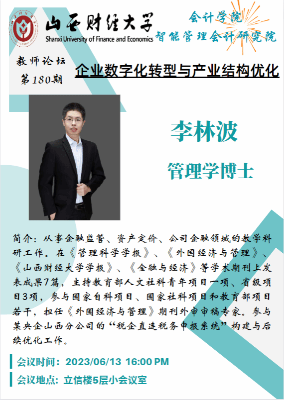 与智能管理会计研究院联合举行了第180次教师论坛。本次论坛由智能管理会计研究院副院长李颖教授主持,主要内容为研讨李林波老师的工作论文《企业数字化转型与产业结构优化》。
