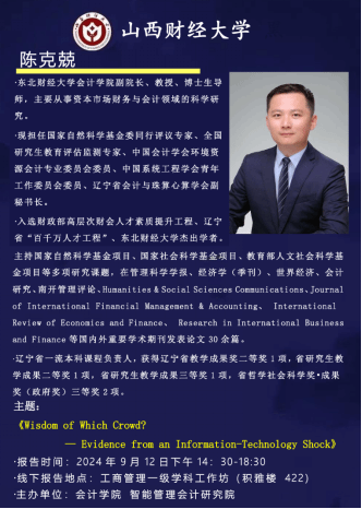 2024年9月12日下午,直播做爱 在积雅楼422举办学术研讨会,邀请东北财经大学直播做爱 副院长、博导陈克兢教授做主题报告《Wisdom of Which Crowd? Evidence from an Information-Technology Shock》。