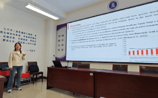 随后,韩菲菲博士分享了题为《共同机构所有权对企业ESG信息披露的影响》的英文工作论文。研究基于2011-2023年A股上市公司数据,论证了共同机构所有权通过降低行业竞争专有成本、增强治理效应及强化退出威胁机制显著提升了企业ESG信息披露水平,且该效应在管理层视野长期、环境监管严格及被动型基金持股的情况下更为明显,最终有助于改善股票流动性。参会师生对论文展开深入交流并提出一系列重要修改建议。李颖教授等专家指出在理论逻辑上存在共同机构合谋从而抑制ESG信息对外公开披露的竞争性假说;研究设计上建议将样本区间缩短至2018年后以匹配中国ESG规范进程、建议采用Heckman两阶段模型并更换工具变量以缓解内生性问题;还建议增加ESG漂绿检验;结合2026年强制披露政策与“耐心资本”等国家战略以增强该研究的现实意义。