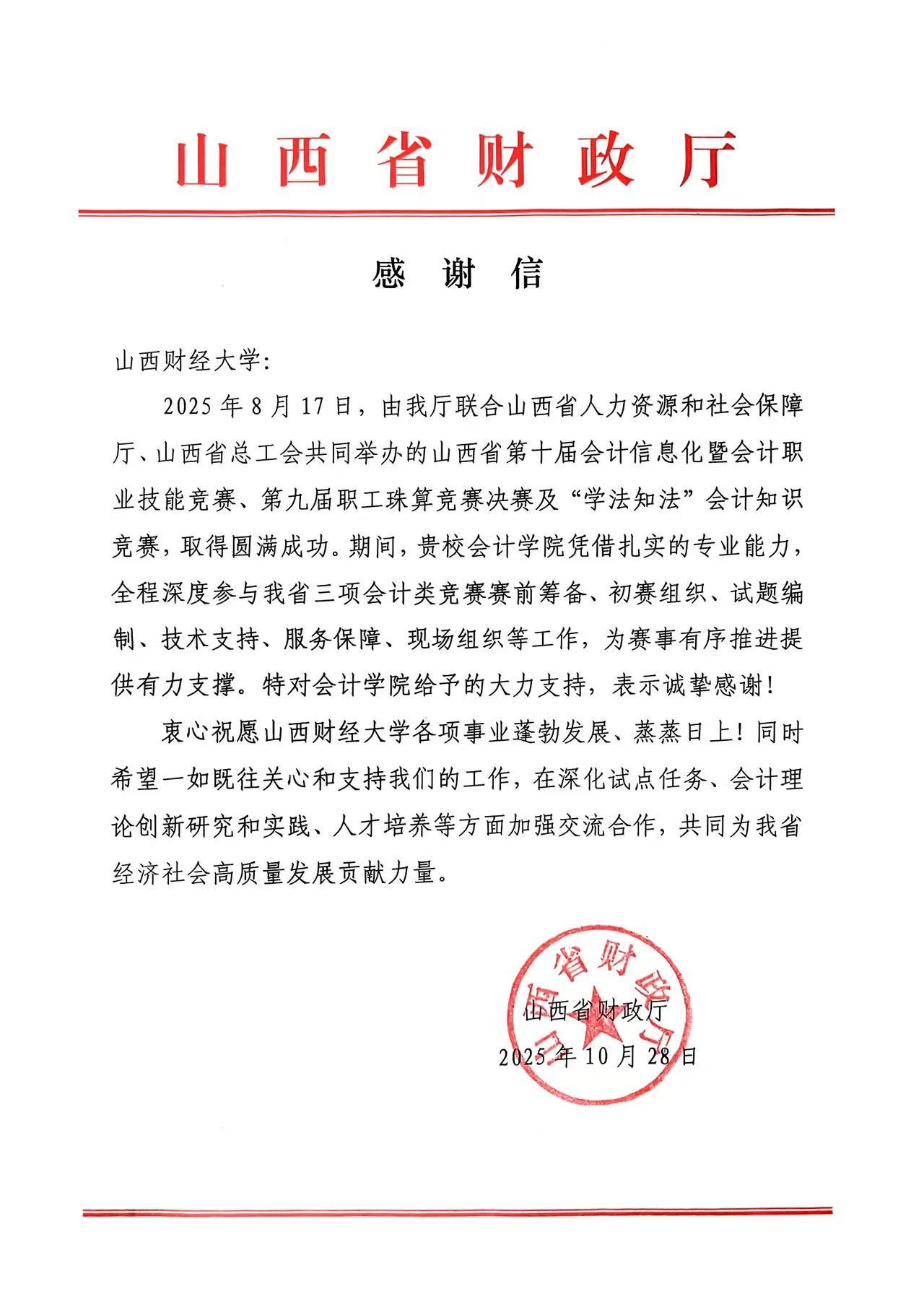 在山西省第十届会计信息化暨会计职业技能竞赛、第九届职工珠算竞赛决赛及“学法知法”会计知识竞赛三项省级重要赛事中的全方位支持与深度参与,致以诚挚谢意。信中高度肯定了直播做爱